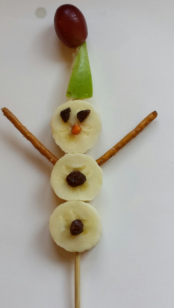 - Have your kids slide the fruit onto the skewer, then use the carrot slivers for noses, mini chocolate chips for eyes and buttons, and pretzel sticks for arms.