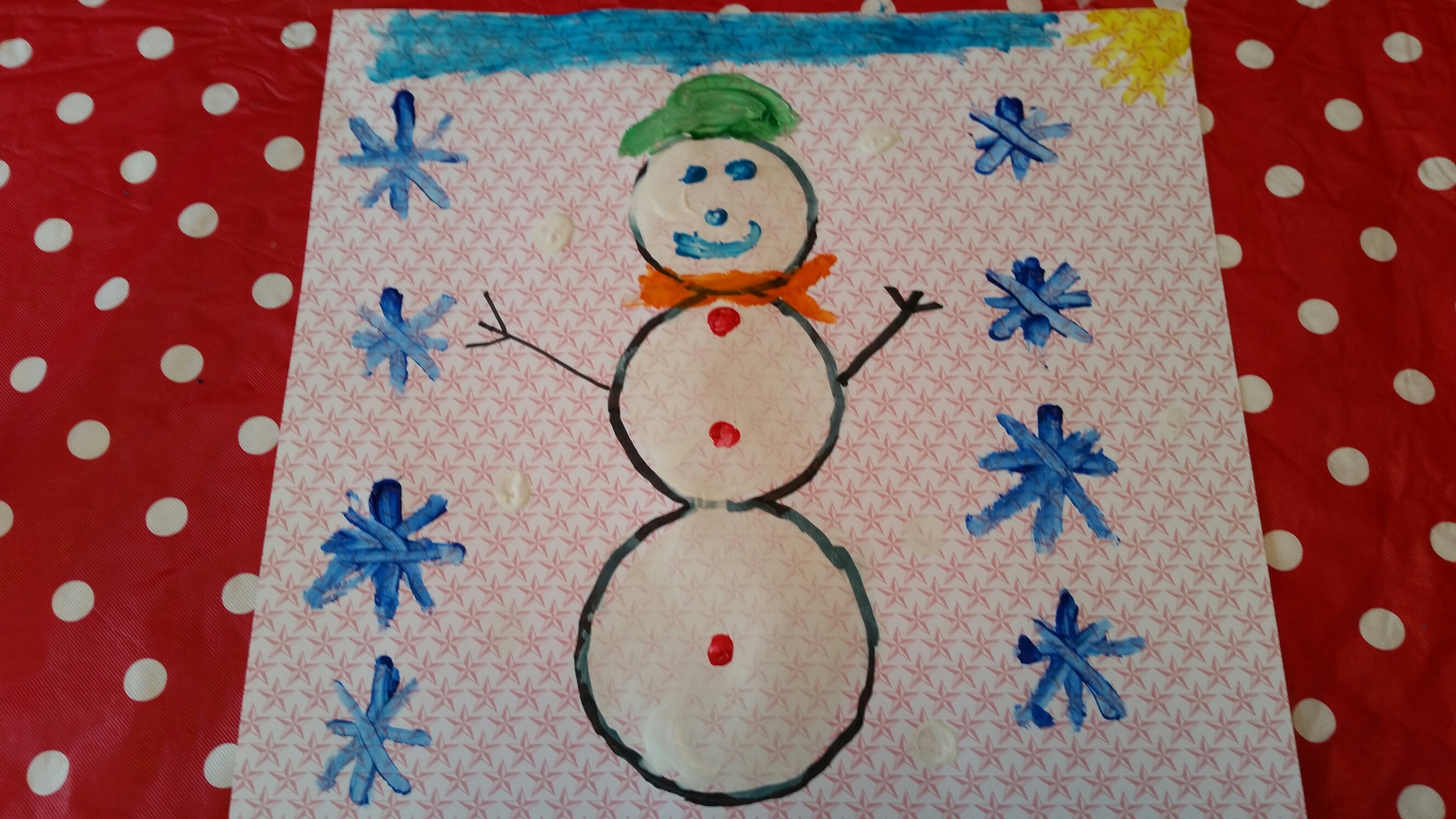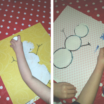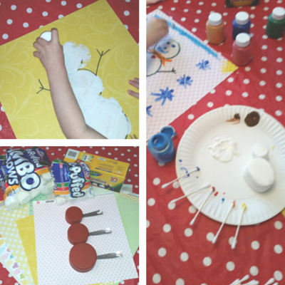 Paint the snowman. It might be easier to give each child a few blobs of paint on a paper plate. The kids loved dipping the marshmallows in the white paint for the body of the snowman. Q-tips were used to add faces and decorations.
