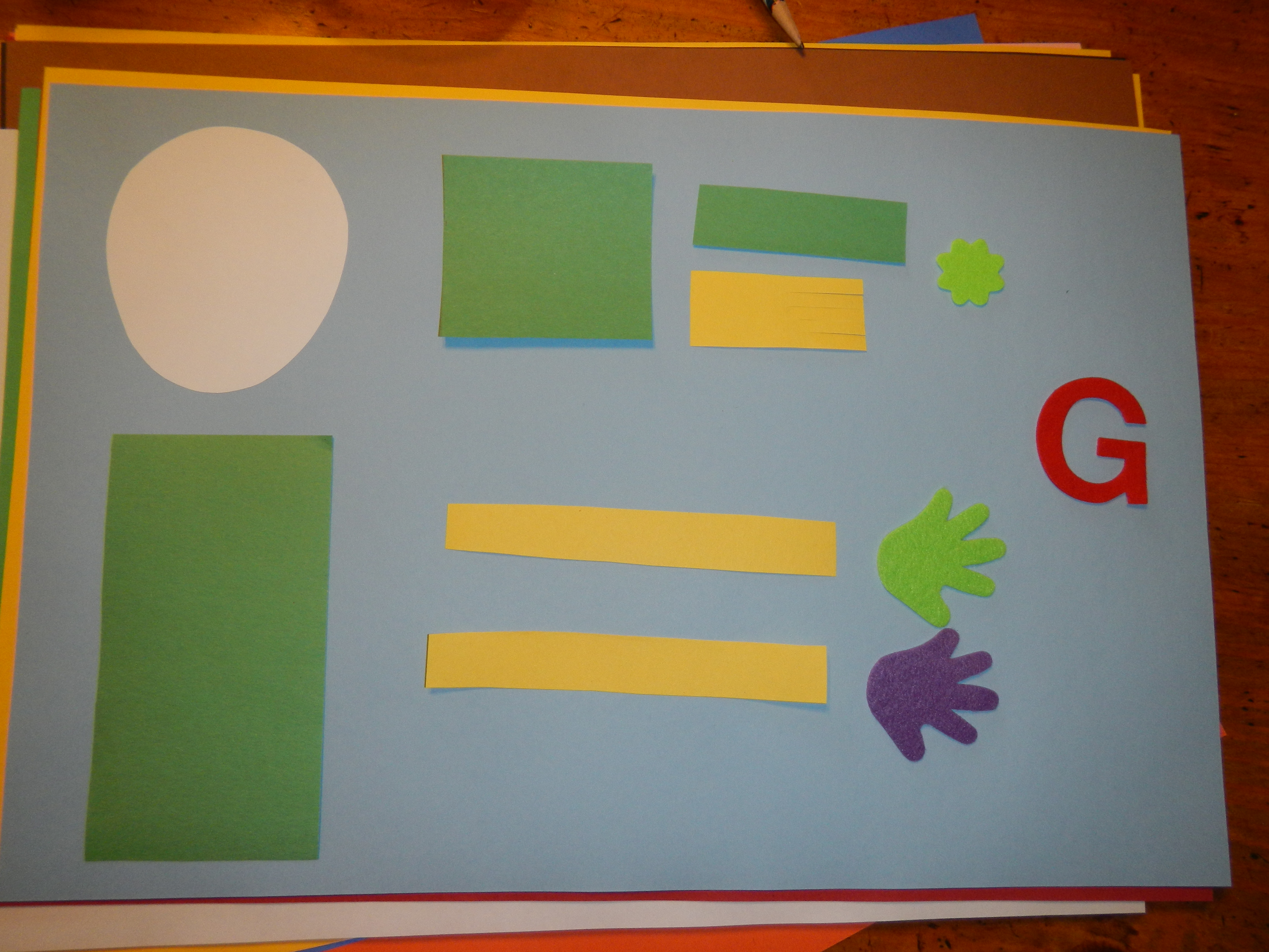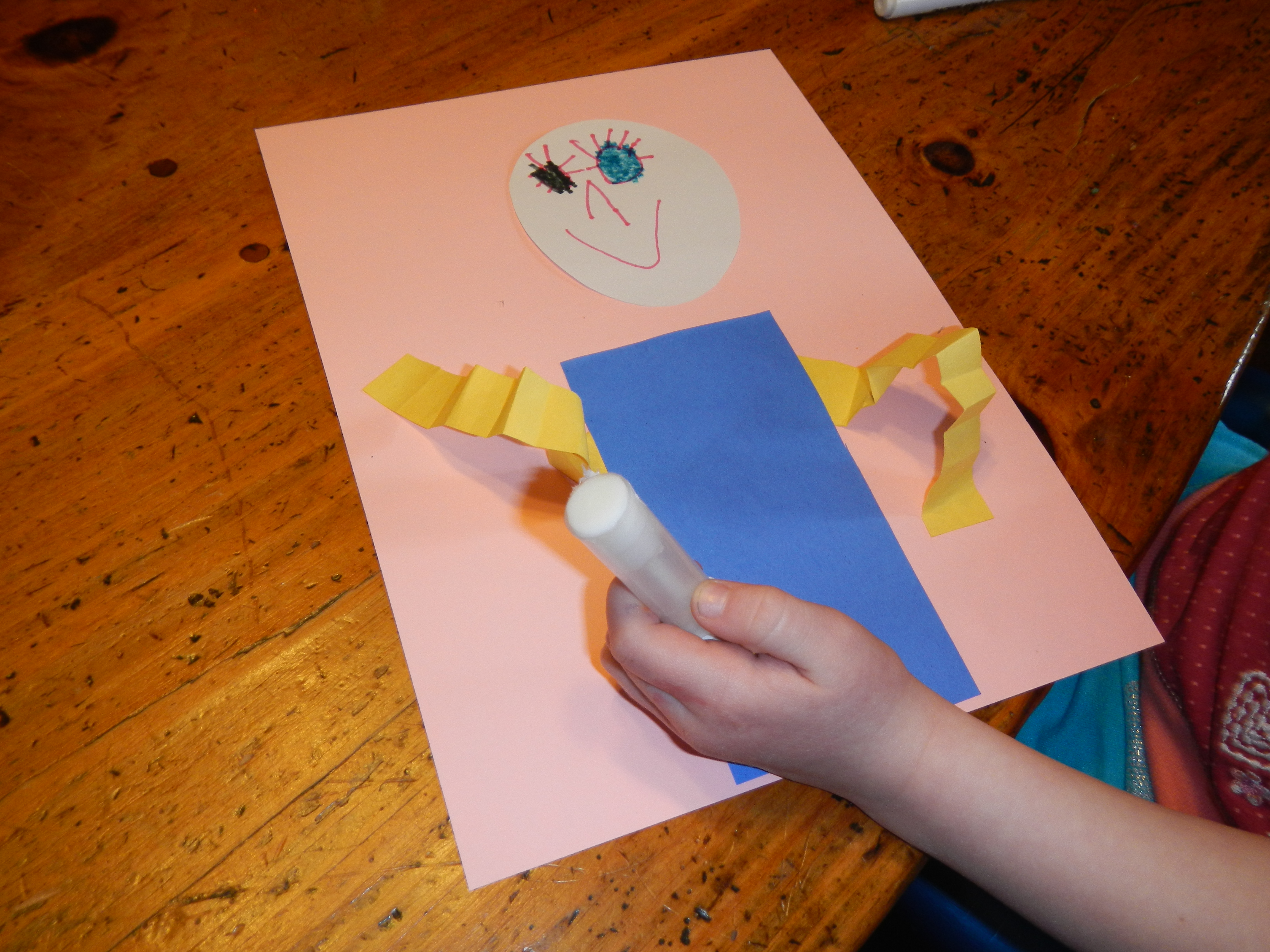 Attach the arms to the big rectangle for the body. Use the glue stick, then flip over the shape and attach to the paper.