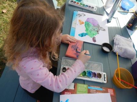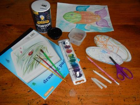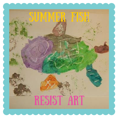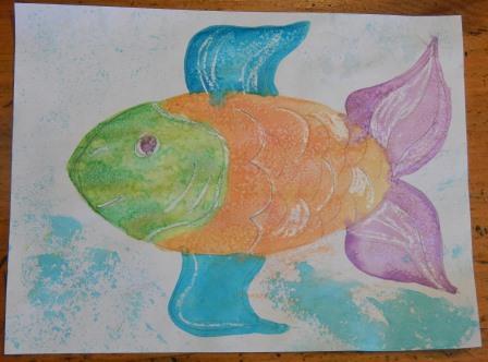 On the fish drawings, use a wax or white crayon to create invisible patterns or scales. They will resist and appear when painted over by watercolors.